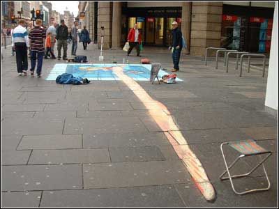 畫家計算好兩種角度結合起來的比例之後,就能夠在街到上作畫了,也因此他的畫作只有一個角度看起來是正常的,從其他地方觀賞會令人覺得怪怪的。