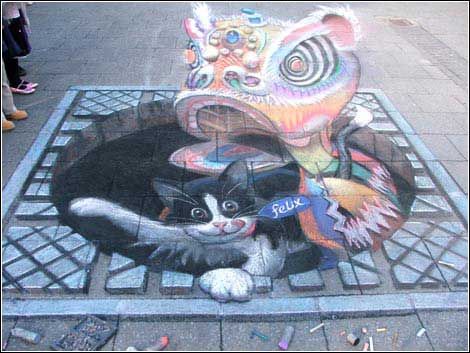 這讓我們發現了一件事,原來,我們的眼睛,也是會上當的啊!Julian Beever充分運用了人們視覺上的弱點,運用透視學,結合繪畫原本要呈現的角度,創造了一個又一個的驚奇,人們奉他為街頭視覺的魔術師。