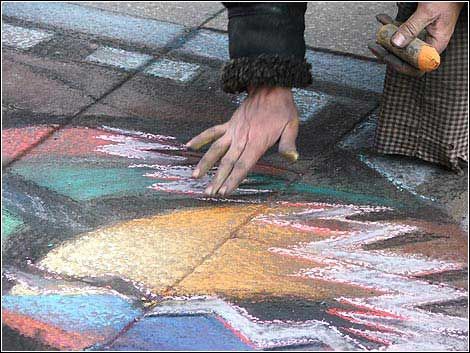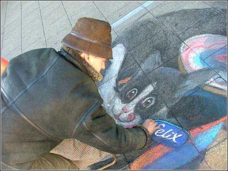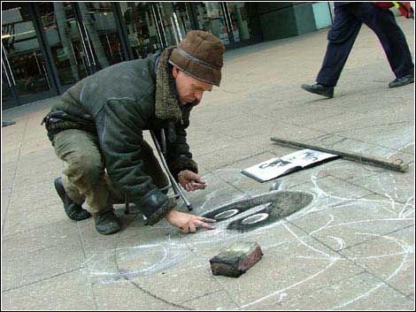 Julian Beever慣用粉筆創作,也因為面積太大,使他經常需要趴著、跪著畫畫,要完成一幅鉅作可是十分辛苦的唷!