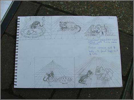 第二個角度,是平面的角度,就是物體距離眼前不遠,呈現完整平面的角度。像草圖中的貓,和中國舞獅,以平面的角度面對著觀眾。